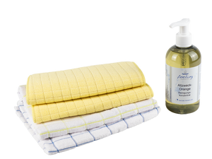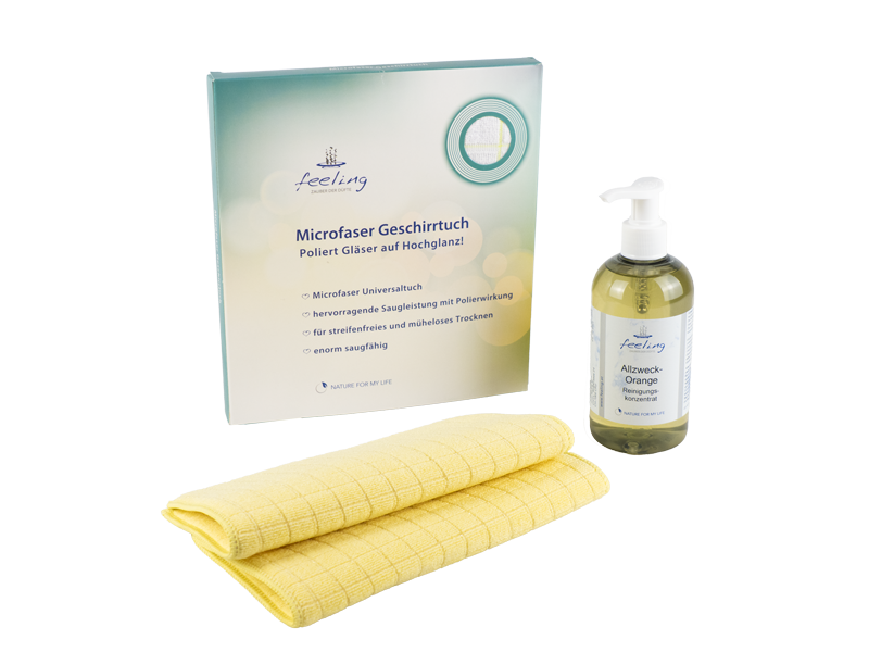 Schaffen Sie Sauberkeit und Reinheit in Ihrer Küche! Mit dem neuen Microfaser Schwammtuch mit Silbergarn reinigen Sie selbst stark verschmutzte Töpfe, Grillbleche, Abwasch und Spülbecken. Unterstützung bei der Reinigungsleistung bietet das Allzweck Orange Öko-Reinigungs-Konzentrat, welches für Geschirr, Spülbecken, Kühlschrank, Küchentisch, Böden uvm. verwendet werden kann. Zum Trocknen und Polieren verwenden Sie das Microfaser Geschirrtuch – megasaugstark und für streifenfreie Sauberkeit!
